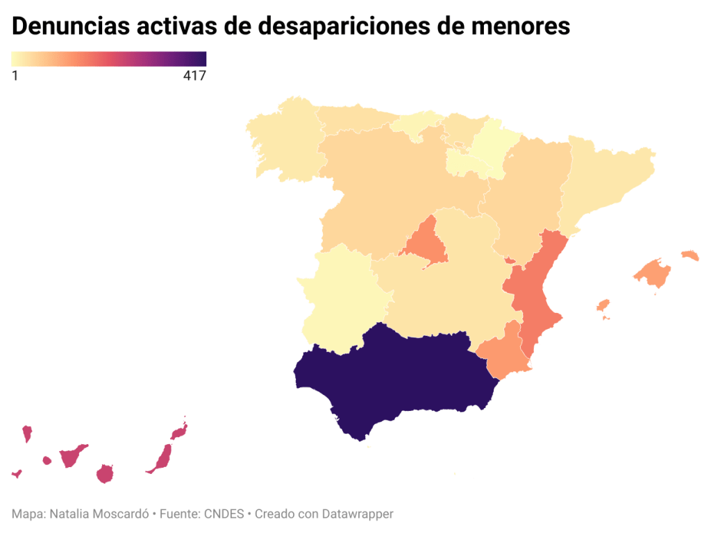 El siguiente mapa muestra una representación visual del número de menores desaparecidos por comunidad autónoma en España, según los datos que ofrece el CNDES. Utilizando una escala de colores, el mapa permite identificar de forma rápida las regiones con mayor concentración de desapariciones notificadas.